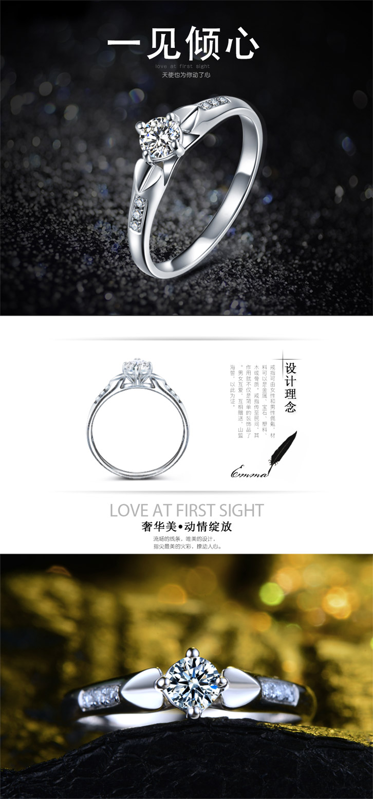 产品说明: 戒指是一种戴在手指上的装饰珠宝。戒指可由女性和男性佩戴,材料可以是金属、宝石、塑料、木或骨质。戒指传至民间,其作用就不仅是简单的装饰品了。男女互爱,互相赠送,山盟海誓,以此为证。钻石希腊文ademas代表不可征服之意。是云云宝石中较坚硬的一种。古罗马人一直认为它代表生命和永恒,到了15世纪更被认定为代表坚贞不渝的结婚象征意义。
